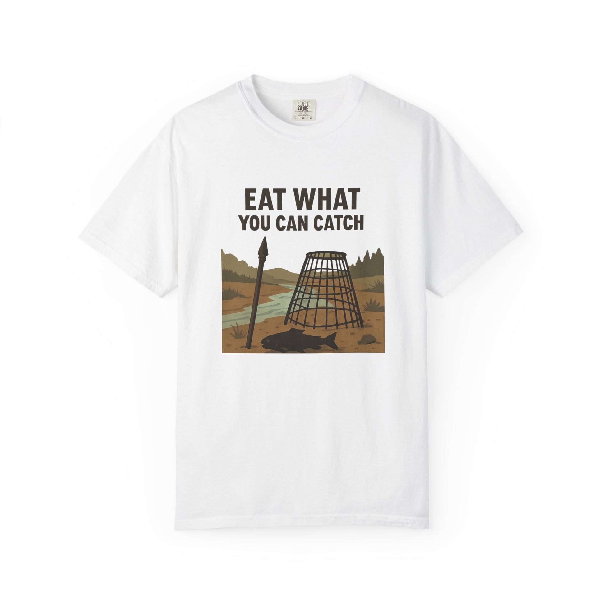 If your cooking philosophy is “catch it or go hungry,” this shirt was made for you. Our “Eat What You Can Catch” T-Shirt celebrates the rugged spirit of outdoor living—fishing, trapping, hunting, and surviving off the land. Featuring a bold wilderness graphic with a fish trap, spear, and outdoor backdrop, this tee is perfect for anyone who takes pride in earning their dinner the old-fashioned way.